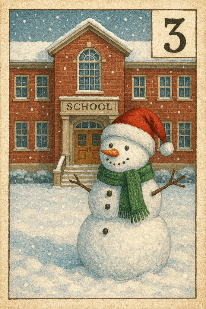KI erstellt mit ChatGPT 5.1 und dem prompt „Erstelle ein Bild mit einem Schneemann, der vor einer Schule steht für einen digitalen Adventskalender.“